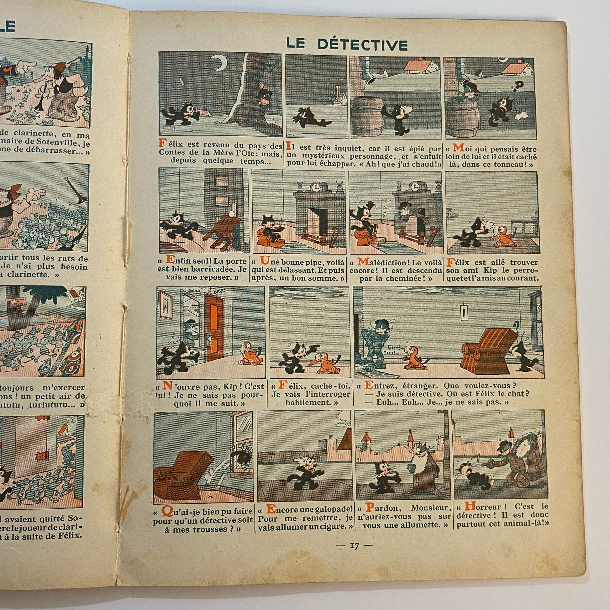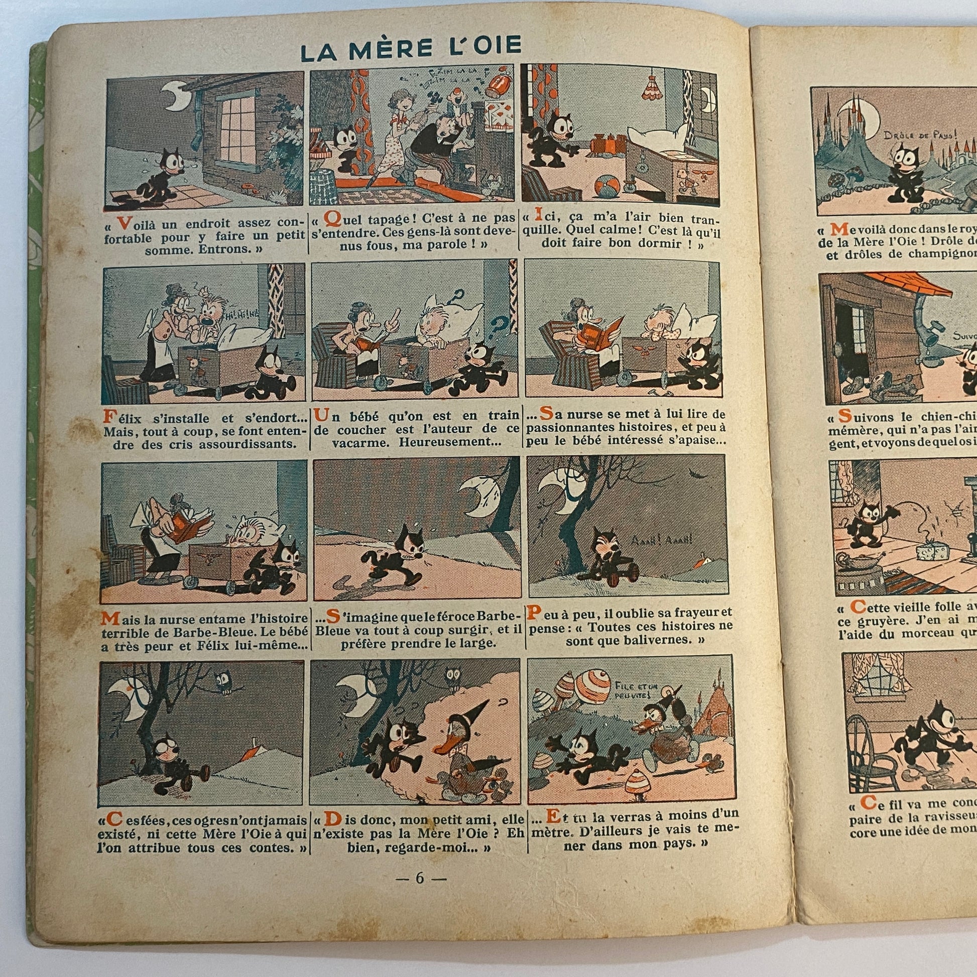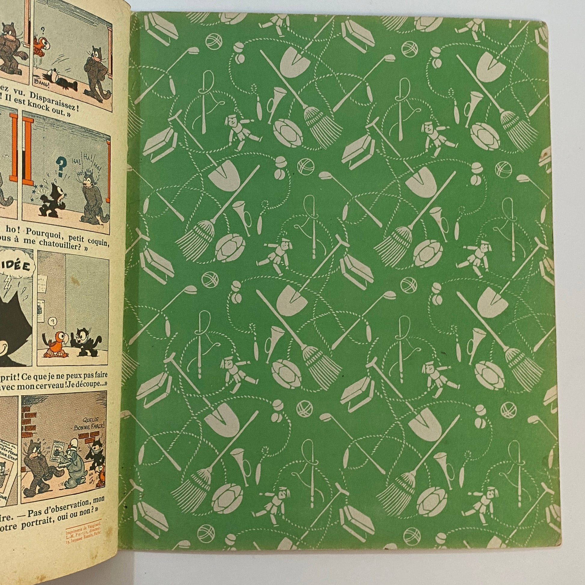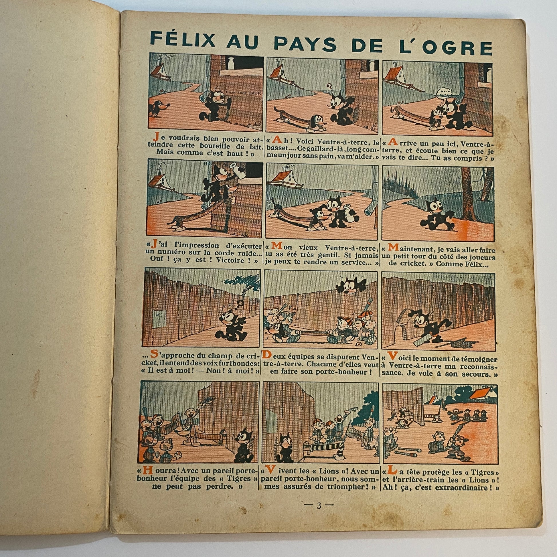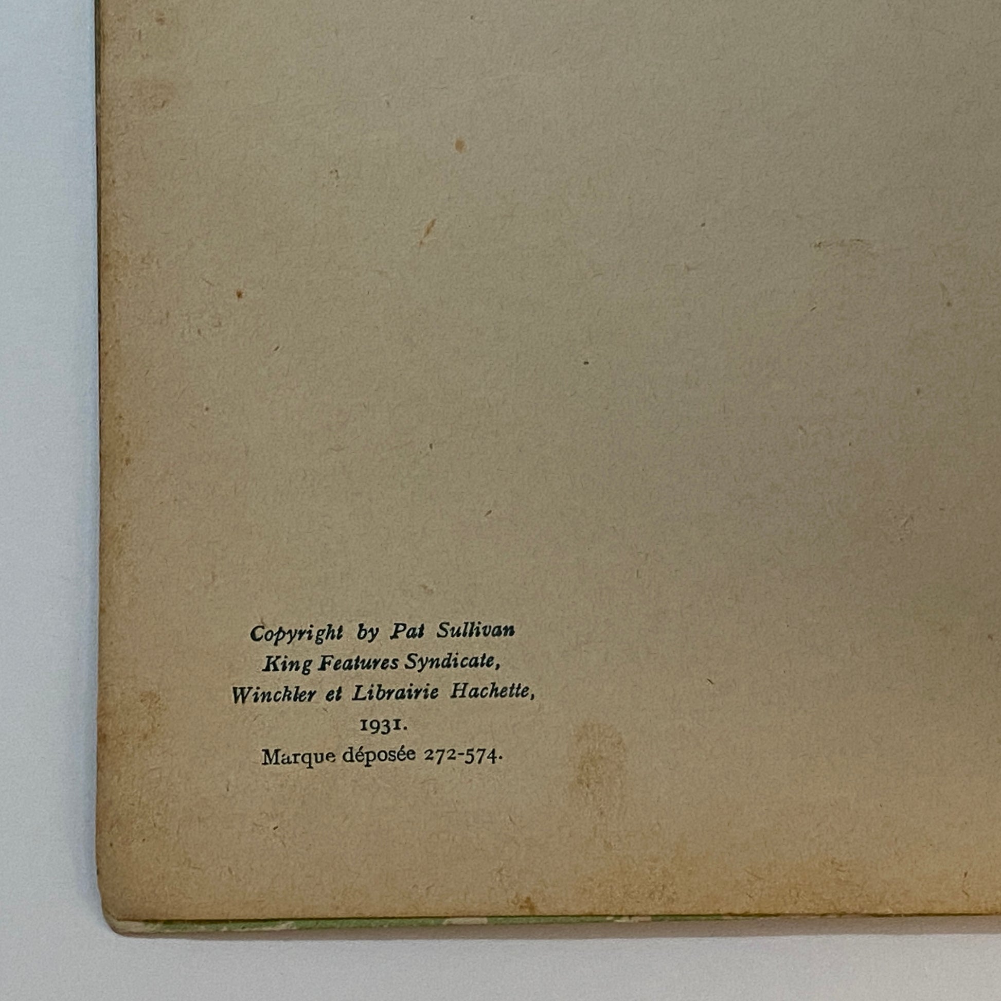 This is a book of strip cartoons featuring Felix the Cat. It consists of 32 pages with 12 individual color illustrations on 30 of the pages, accompanied by short text in French that tells the story. The pages are lightly browned with age, and there is neat writing in pencil across the top of the title page. The outer illustrated covers show some wear on the edges and a few light marks. This book is listed second in a series of six titles, suggesting it is an early reprint. A pleasing copy of a collectible book.