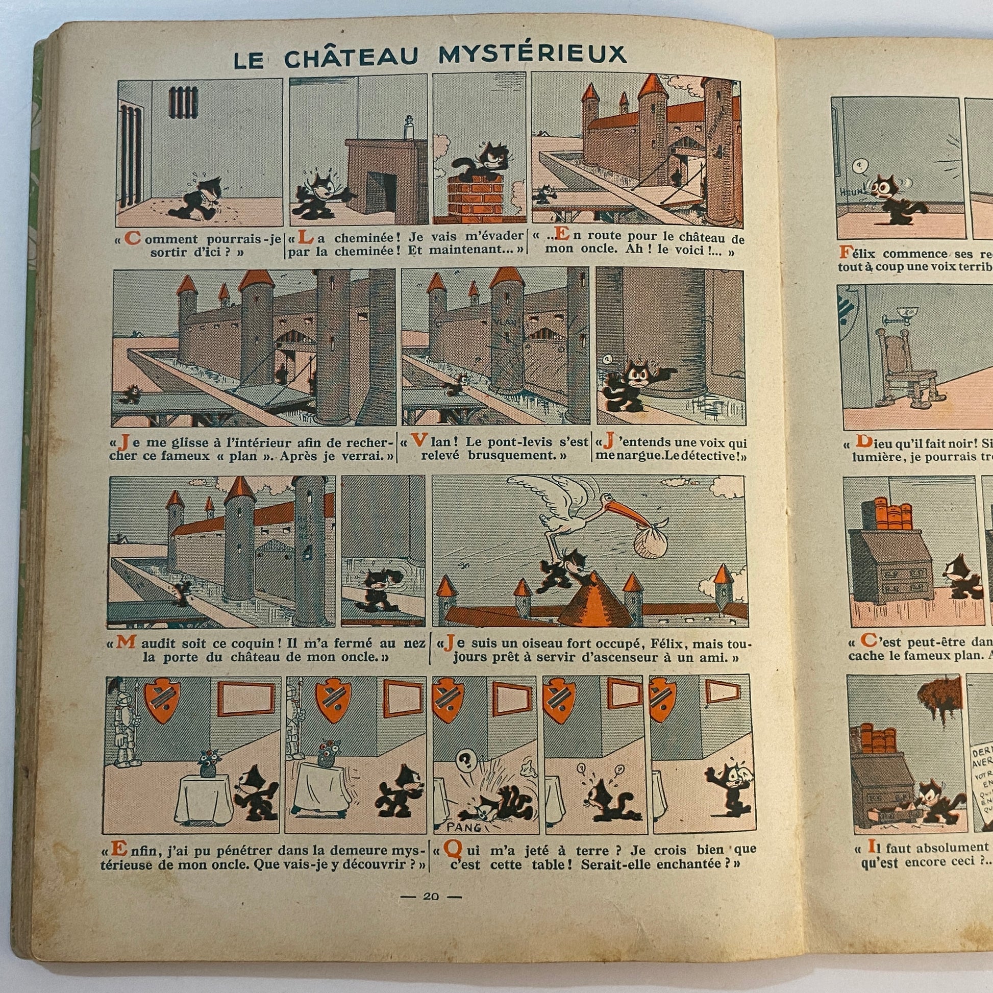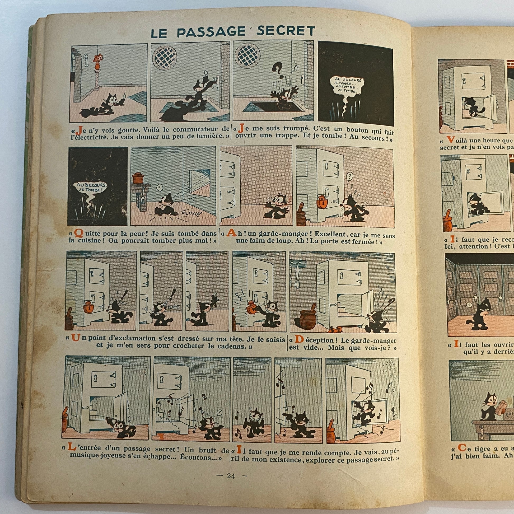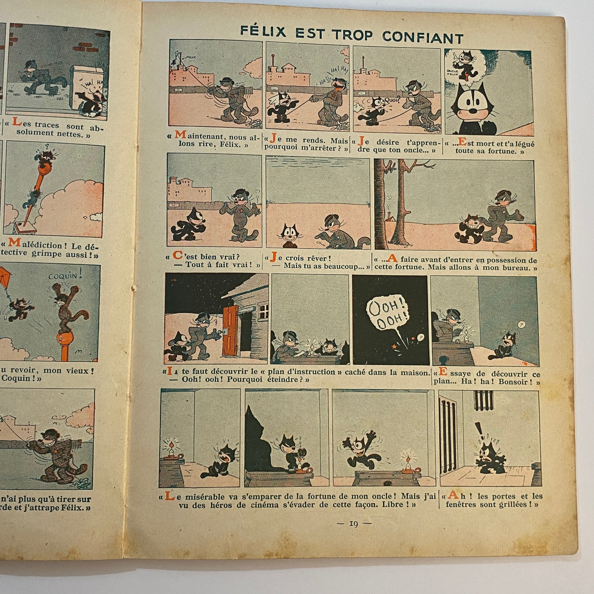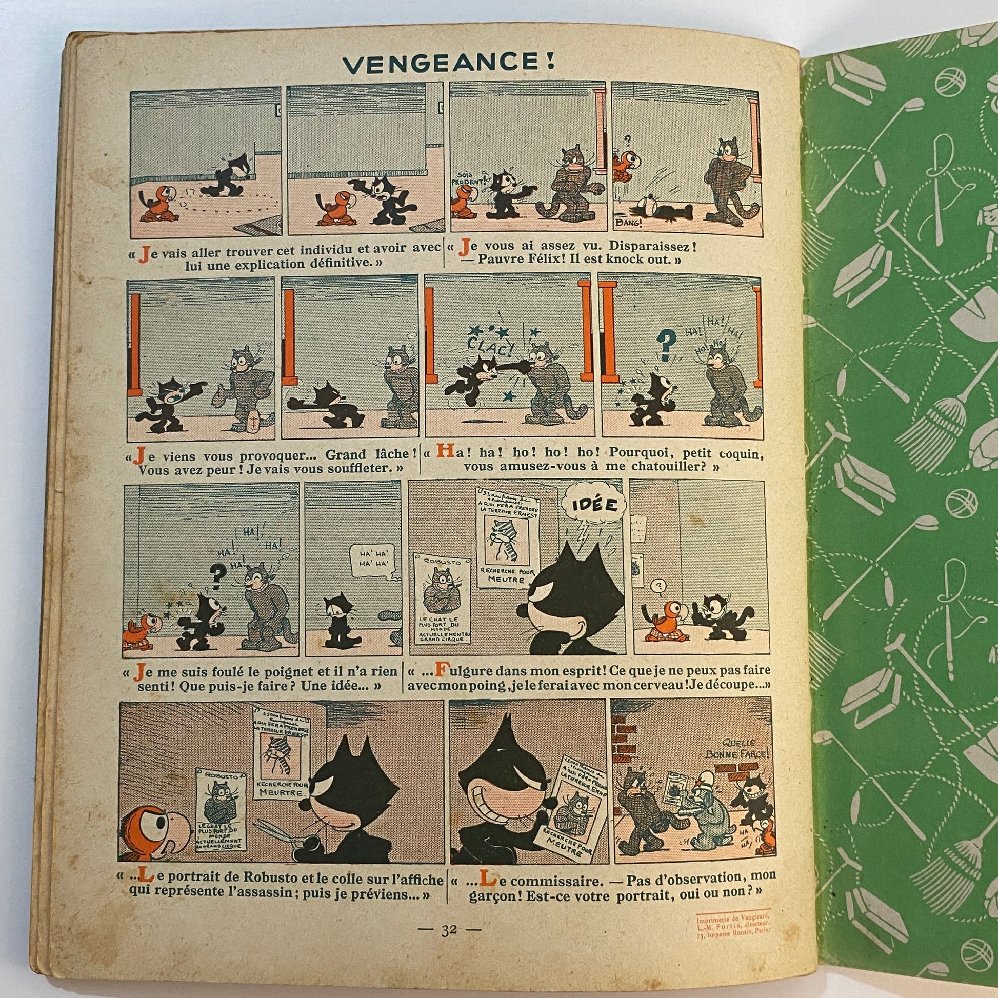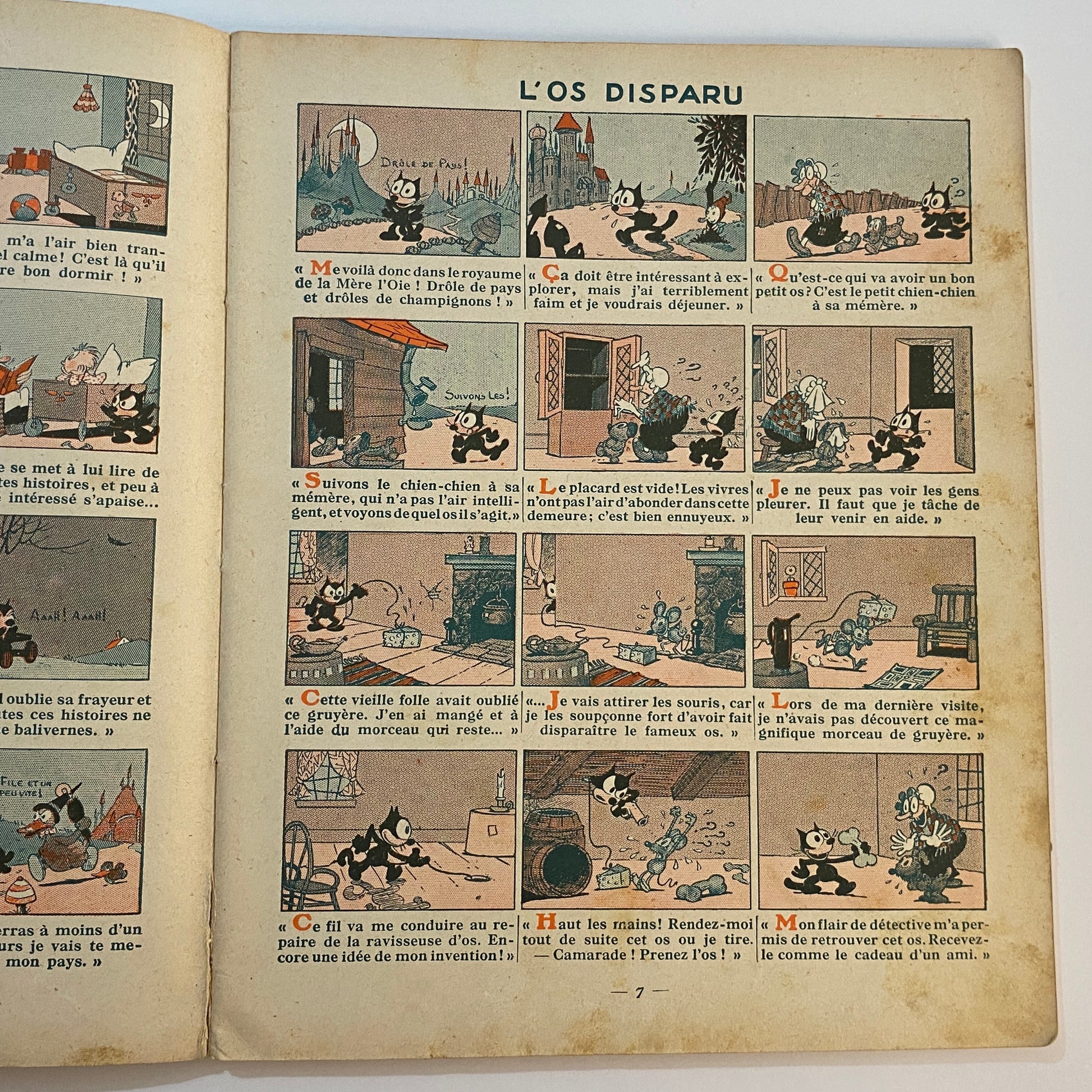This is a book of strip cartoons featuring Felix the Cat. It consists of 32 pages with 12 individual color illustrations on 30 of the pages, accompanied by short text in French that tells the story. The pages are lightly browned with age, and there is neat writing in pencil across the top of the title page. The outer illustrated covers show some wear on the edges and a few light marks. This book is listed second in a series of six titles, suggesting it is an early reprint. A pleasing copy of a collectible book.