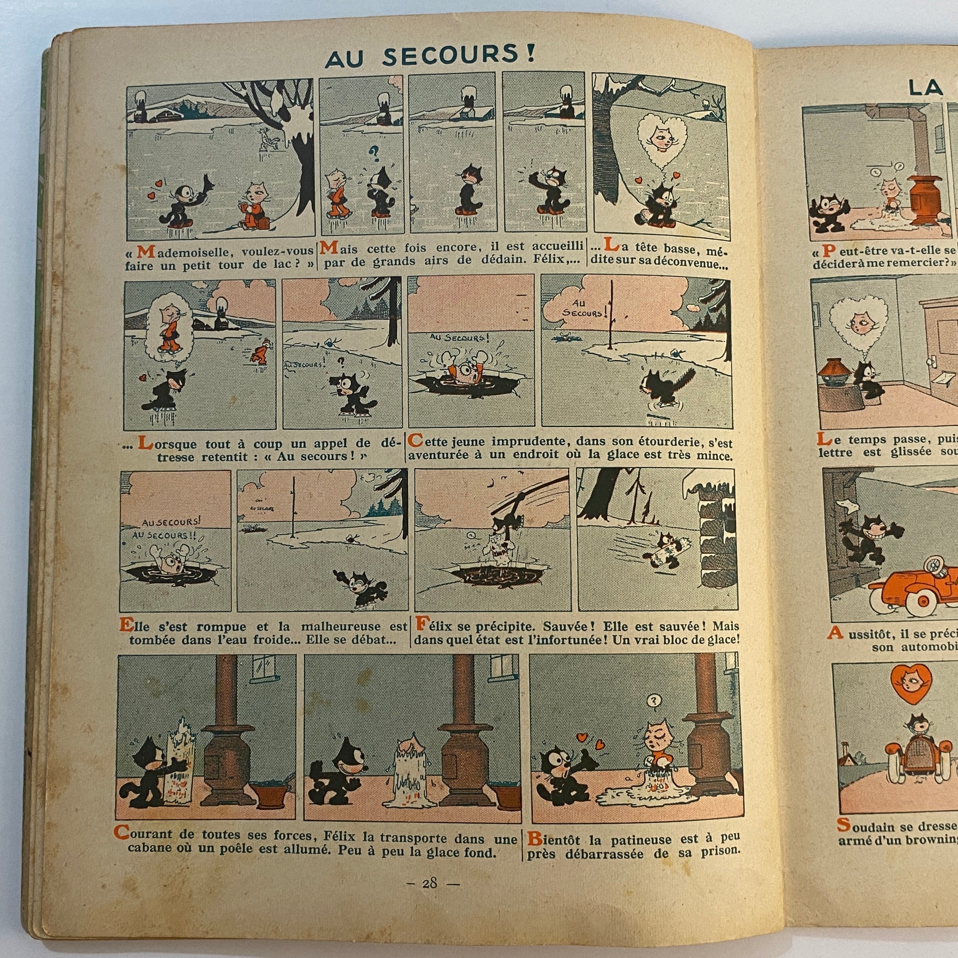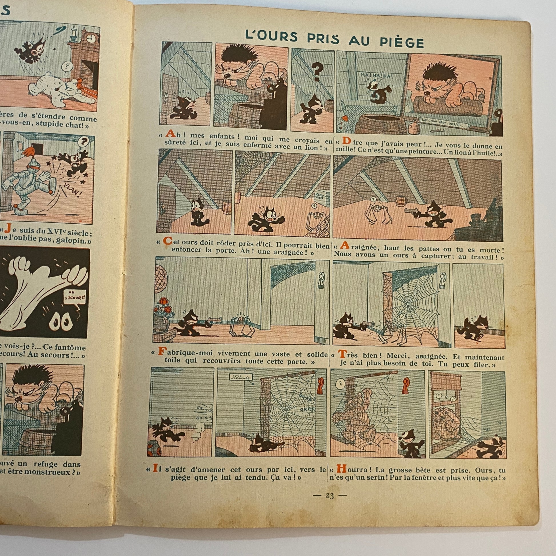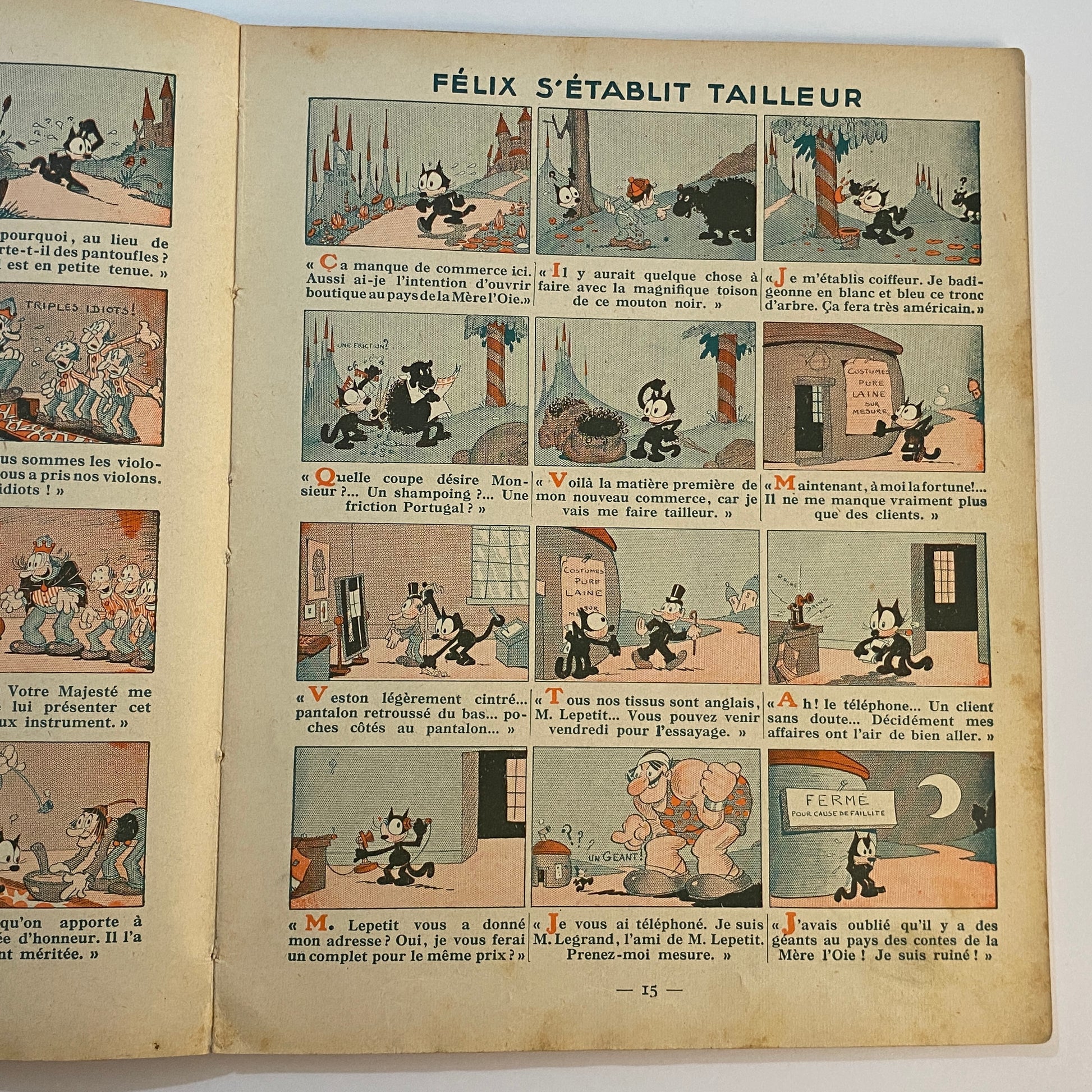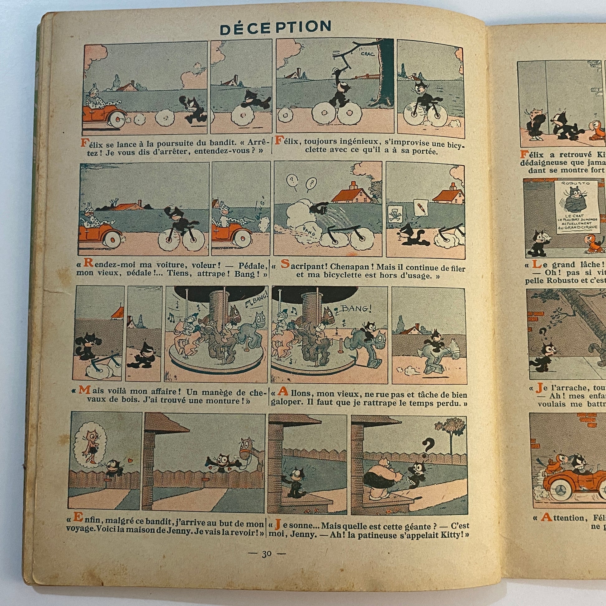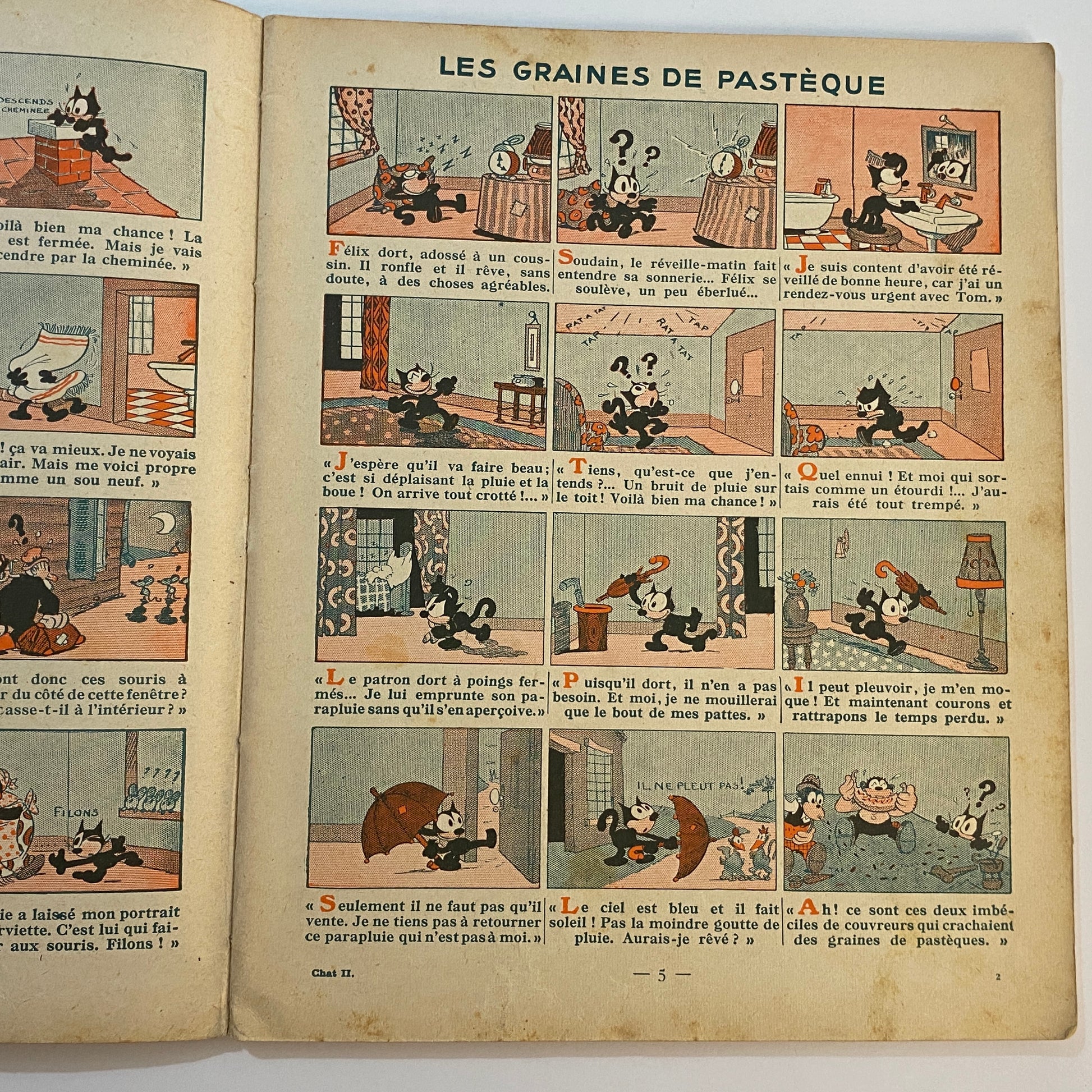 This is a book of strip cartoons featuring Felix the Cat. It consists of 32 pages with 12 individual color illustrations on 30 of the pages, accompanied by short text in French that tells the story. The pages are lightly browned with age, and there is neat writing in pencil across the top of the title page. The outer illustrated covers show some wear on the edges and a few light marks. This book is listed second in a series of six titles, suggesting it is an early reprint. A pleasing copy of a collectible book.
