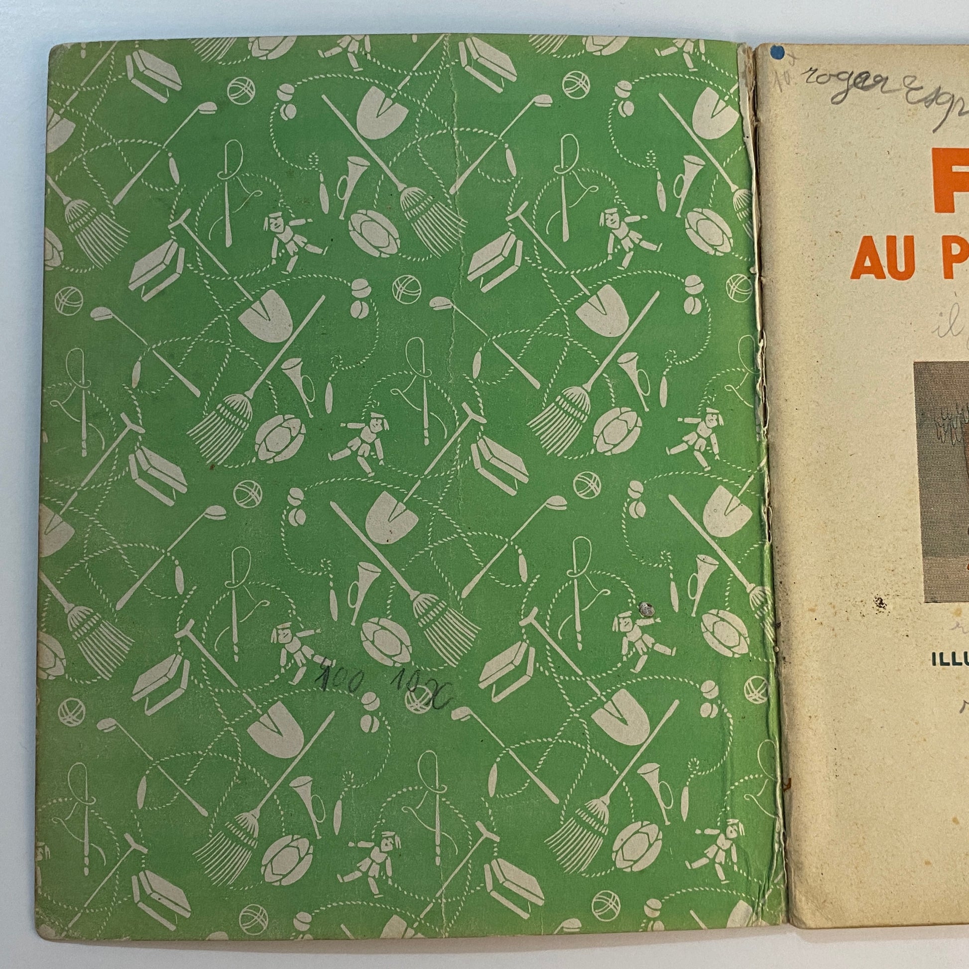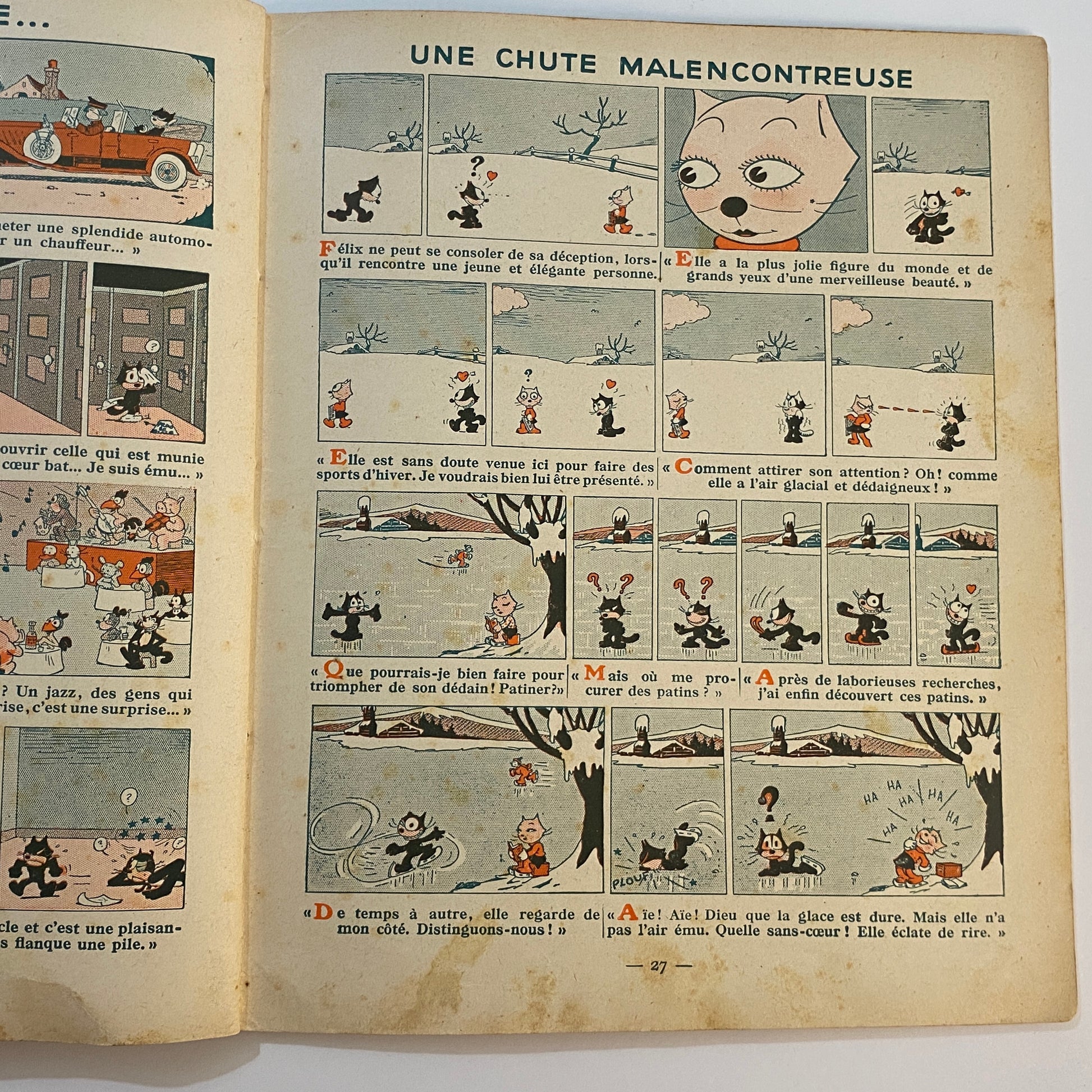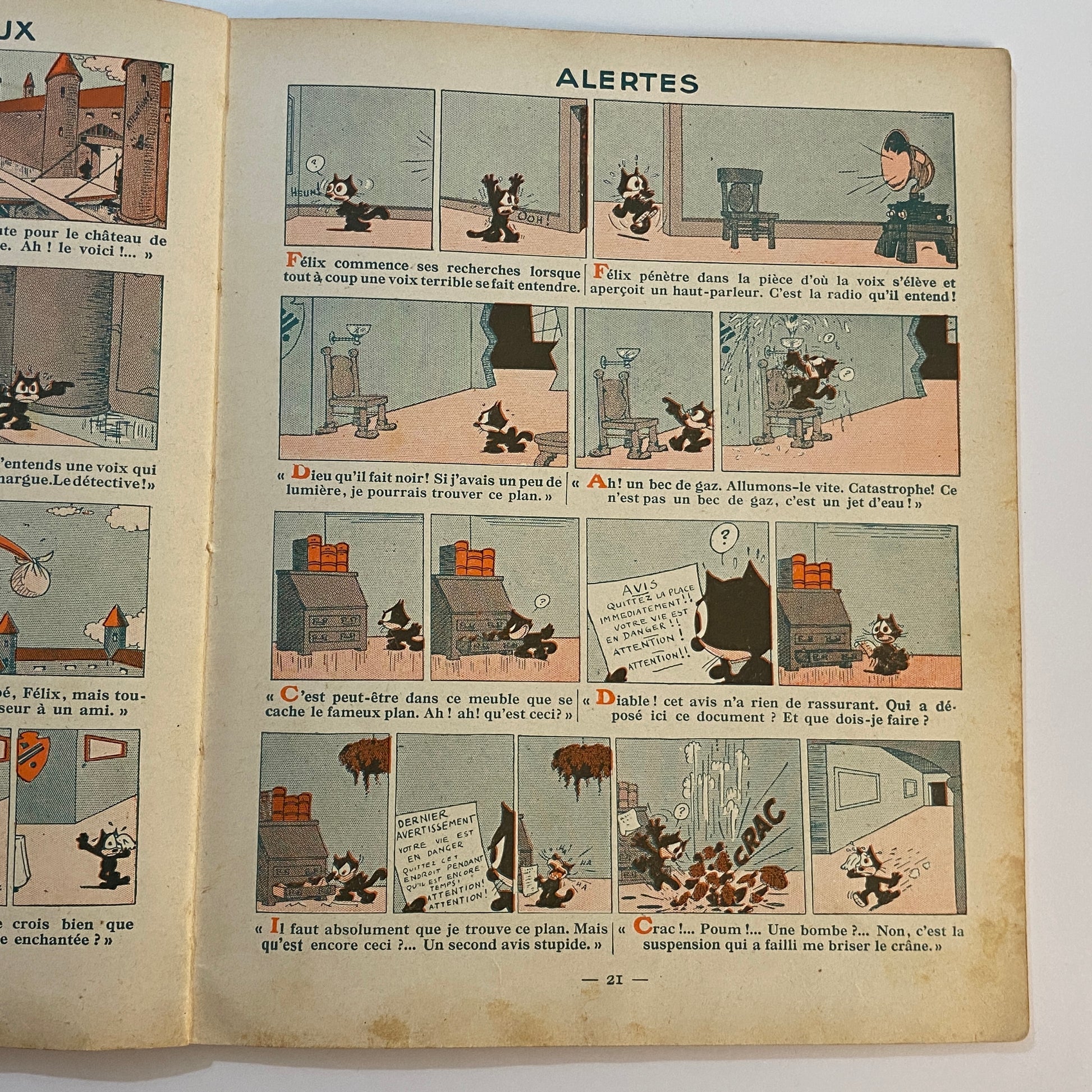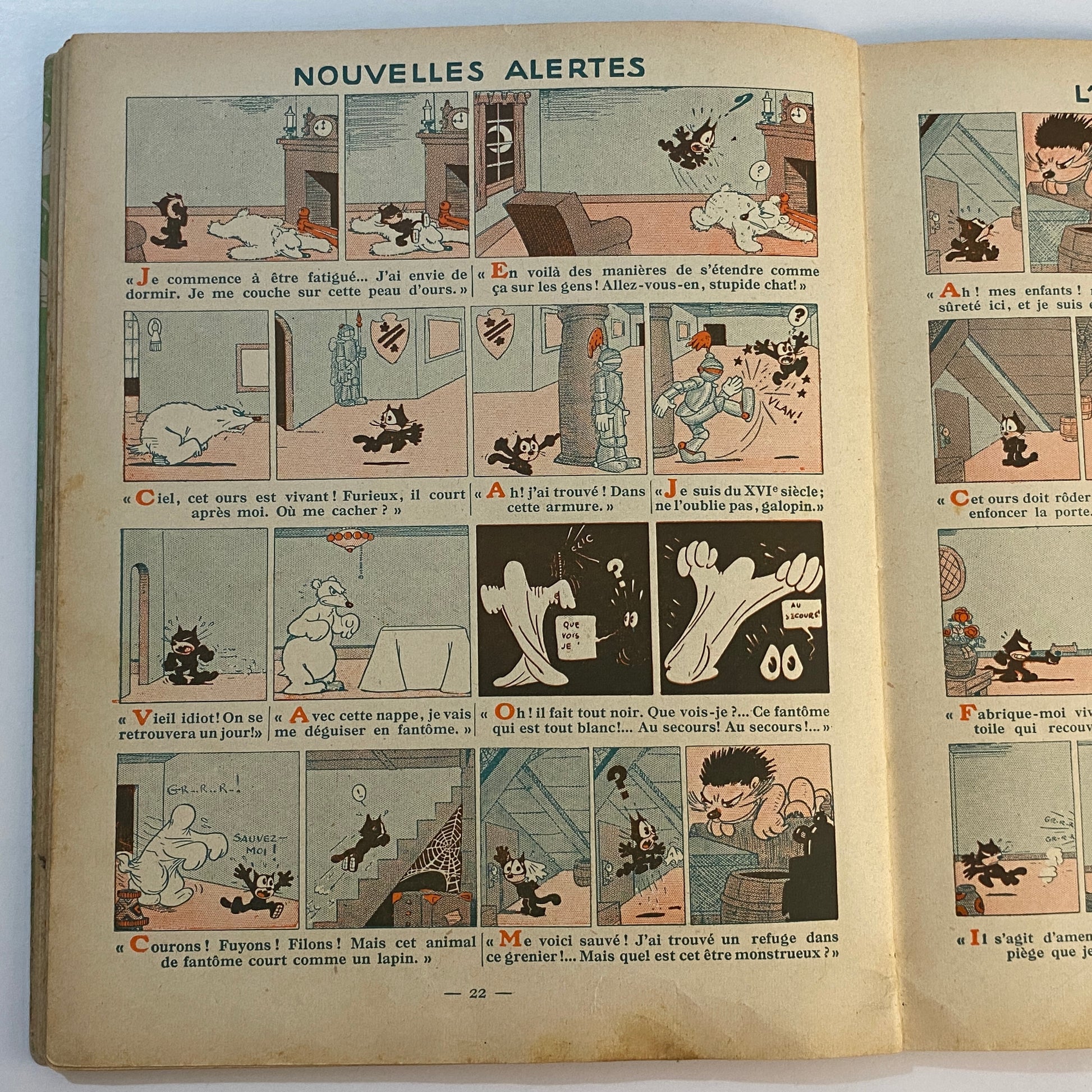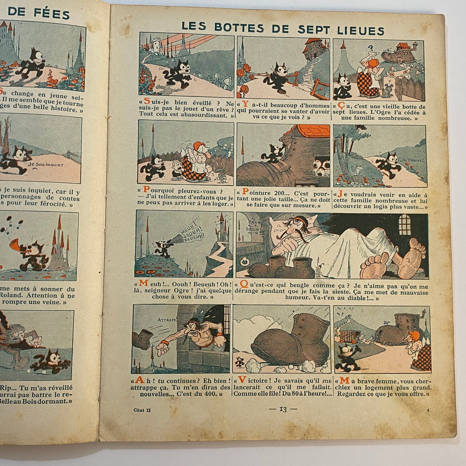 This is a book of strip cartoons featuring Felix the Cat. It consists of 32 pages with 12 individual color illustrations on 30 of the pages, accompanied by short text in French that tells the story. The pages are lightly browned with age, and there is neat writing in pencil across the top of the title page. The outer illustrated covers show some wear on the edges and a few light marks. This book is listed second in a series of six titles, suggesting it is an early reprint. A pleasing copy of a collectible book.
